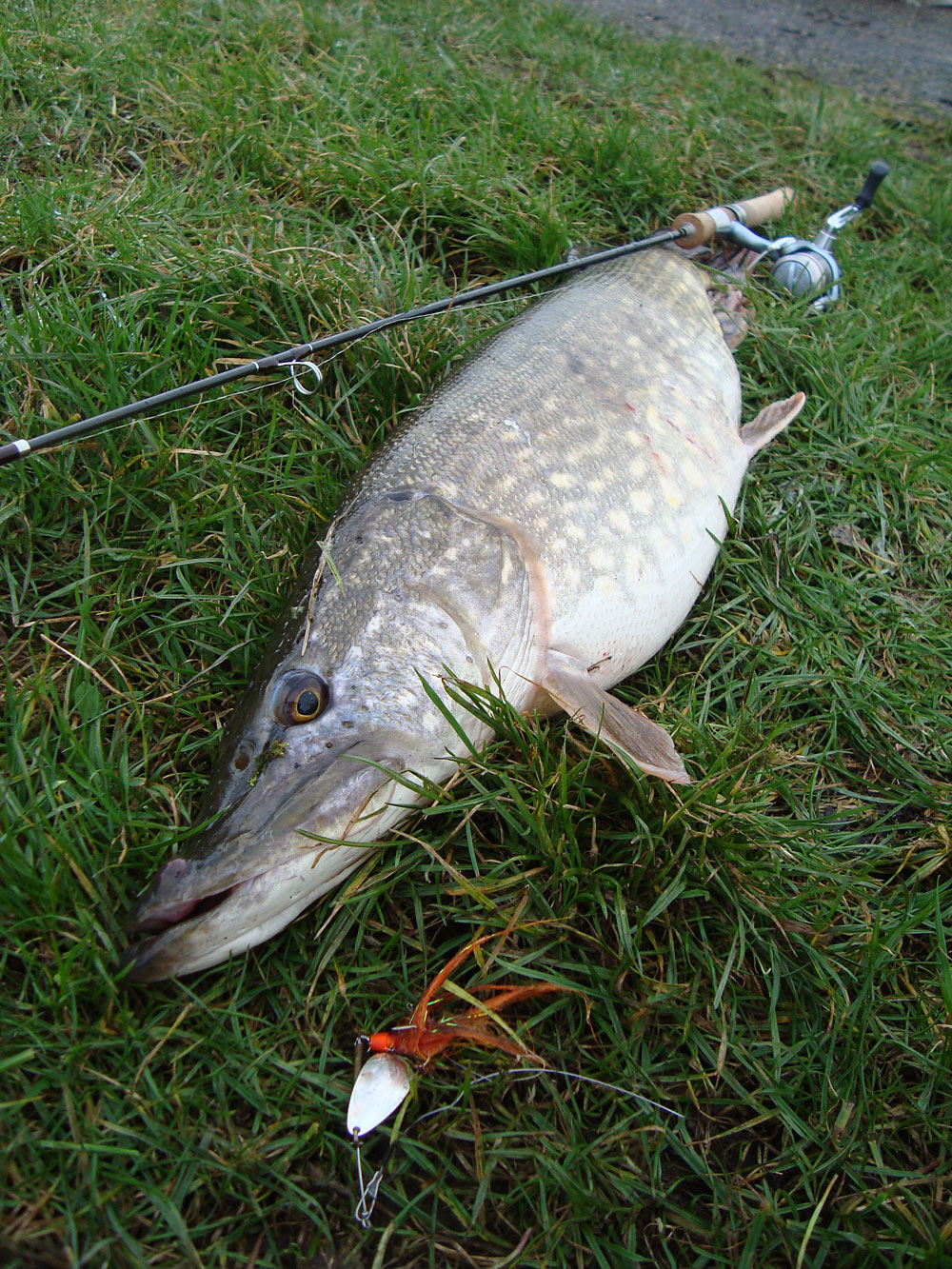 Een paar dagen nadien komt er een dag vrij, ik rij terug naar de polder want het waait te hard voor zowel de belly als de boot. Omdat ik alleen ben besluit ik wat te gaan ‘dieven’. Vissen waar ik niet mag. Ik ken een aantal stukjes water waar het goed vissen is, helaas zwaait er ‘zogezegd’ een beroepsvisser de plak. Ik weet dat er mooie snoeken zwemmen, en 20 minuten later heb ik er al eentje! Op een zelfgemaakt spinnertje en m’n CWJ 5-grammertje. Make my day, baby! De rest van het stuk geeft me niks meer en ik rij kilometers verder, het grote water over. De nodige moeite, een zoektocht, een wandeling. Nochtans vang ik de rest van de dag maar één visje meer, na stug doorvissen. Ik zou het nog beginnen geloven dat hier erg veel vis naar de haaien is door de winter…