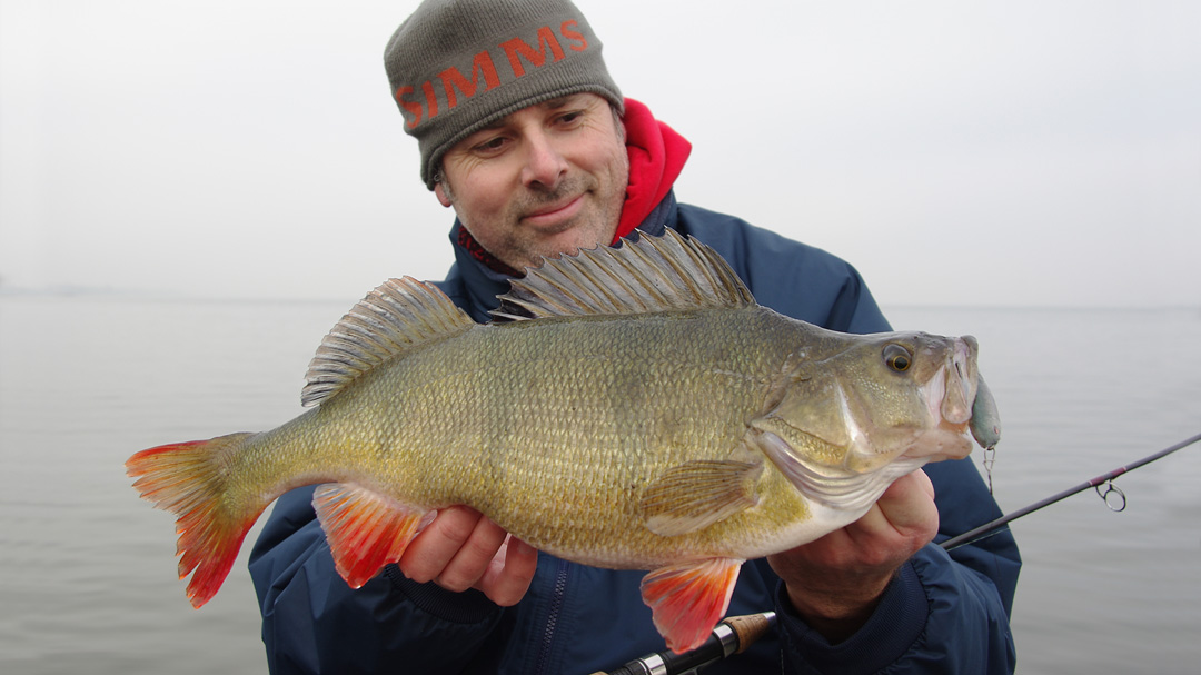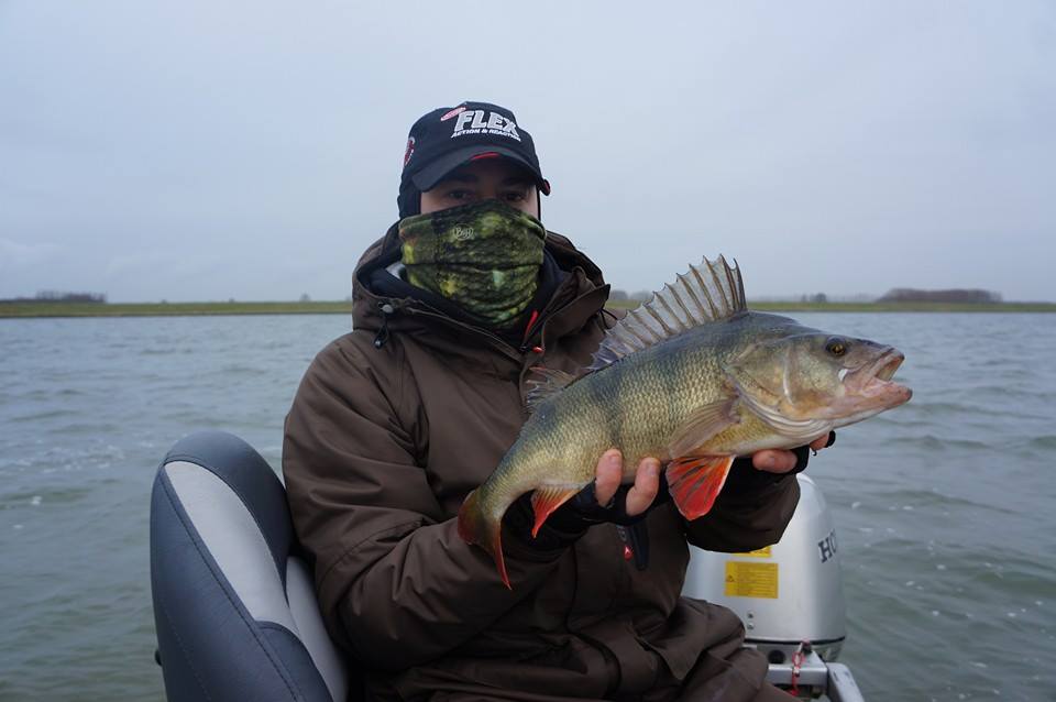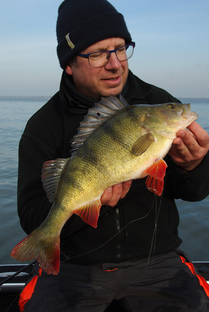 Volgende visdag was er eentje met collega Dirk. Om kort over te zijn. Bitter koud en totaal geen actie voor ons. De aanbeten die we in de ochtend kregen werden niet verzilverd en ik kreeg er kop noch staart aan. Buiten een snoek en een baars werd er niks gevangen. Tegen de avond vond ik er niks beter op om nog een stukje te trollen. Als er één ding is wat ik verschrikkelijk saai vind dan is het trollen wel… Ik had slechts twee twee kleine Storm Thundersticks mee (voor noodgevallen als deze) en die kregen we tot op bijna 4 meter diep. Al gauw liepen we tegen een paar vissen aan met als mooiste een PB baars van goed in de veertig voor Dirk! Was hij zo blij mee!