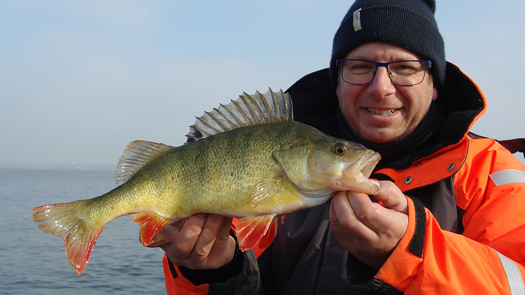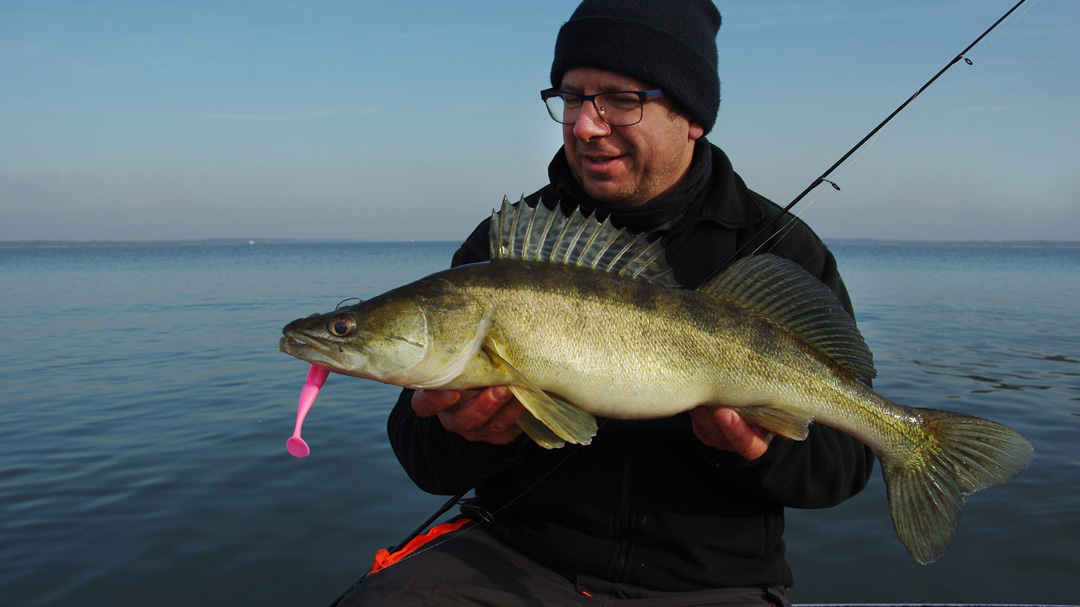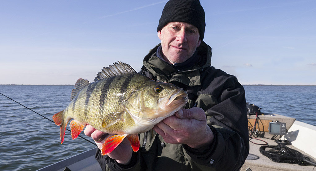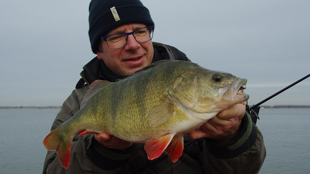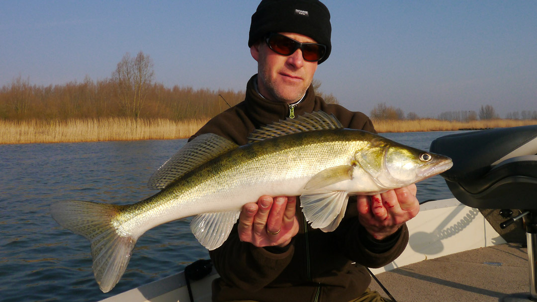 Storm voorspeld. Marc besloot op vrijdag een dagje te nemen. Het was dit, of niet vissen. ‘Geert, ga je mee vissen?’ verscheen er in het sms-je. Ik had de dag anders gepland maar voor het vissen laat ik alles vallen en nauwelijks 8 uur later ben ik klaarwakker en zijn we weg. Voor dag en dauw zitten we op neerlands grote water en de zon laat zich van haar beste kant zien. De bedoeling is om werpend te vissen met klein kunstaas en eventueel -als dit niet lukt- te gaan vertikalen. We besluiten de stekken aan te doen waar we 14 dagen geleden puike actie hadden en geen tijd te verliezen met nodeloos varen. Dus, de eerste snoekbaars hangt er al aan in het eerste licht. Op anderhalve meter water, met temperatuur 5,7 graden. Het roze homo-shadje deed het weer. Tof! Ondertussen verdwijnt de zon om plaats te maken voor dreigend en guur weer. We kunnen onze handschoenen goed verdragen!