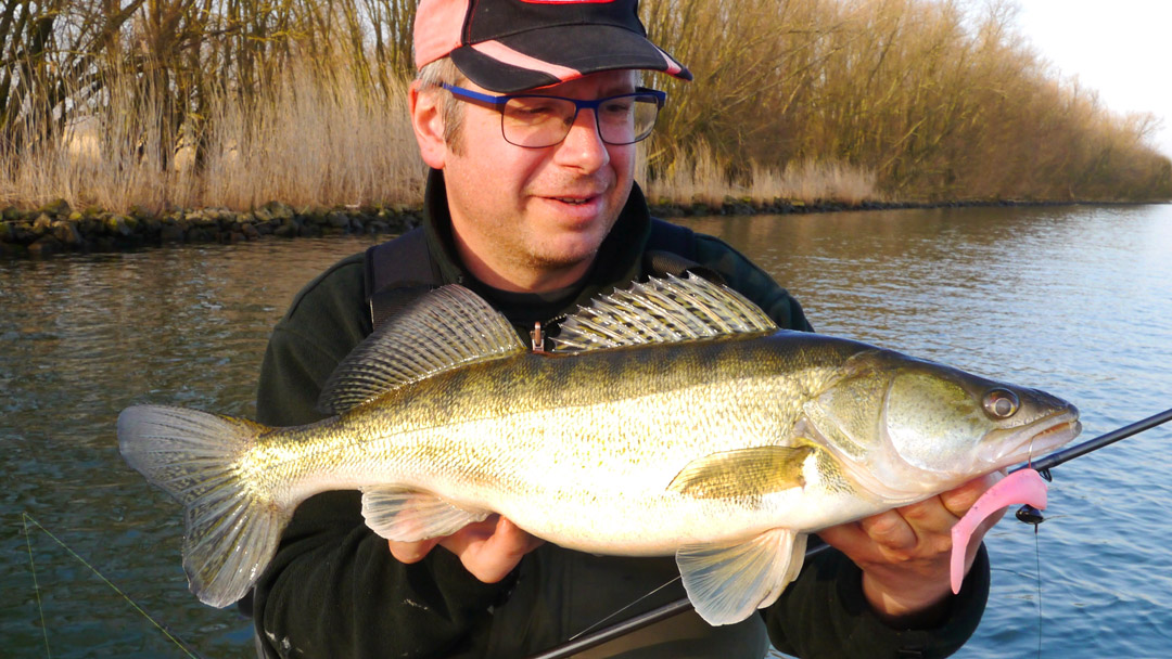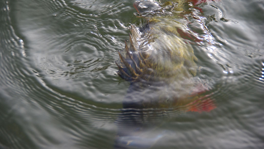 Logische conclusie: warmer water zoeken en uit de wind gaan liggen. Dat loonde en de eerste worp op een nieuwe stek bracht me een snoekbaars. Hier zaten ze dus wél ondiep. Traag trok de frontroller ons op weg, heerlijk relax werpen en met een tiengrammertje de bodem aftikken. No stress. Zonlicht op de snoet.