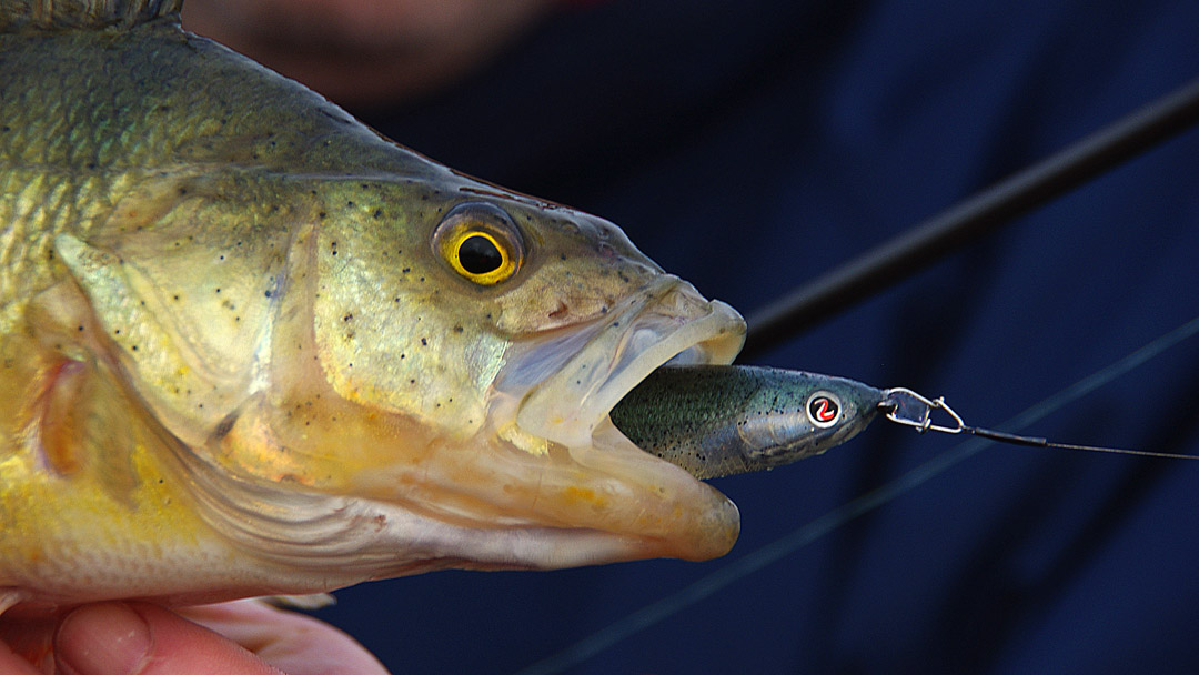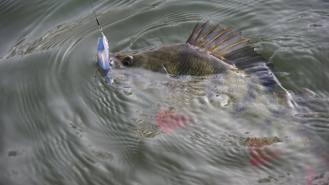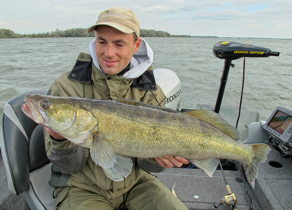 Zondag was wind voorspeld. Poetrellenweer. Eens kijken of we er een dikke biels uit konden trekken. Lange tijd geleden. Dieplopers achter de boot, kussen onder het zitvlak, een thermos doping om wakker te blijven. De plug die het verschil maakte, was de Salmo Super Deep Runner Perch (14 cm – code PH14SDR). Duikt vlot voorbij de 6 meter. Ideaal voor een grote eendebek die op 8 meter tegen de bodem de wacht houdt.