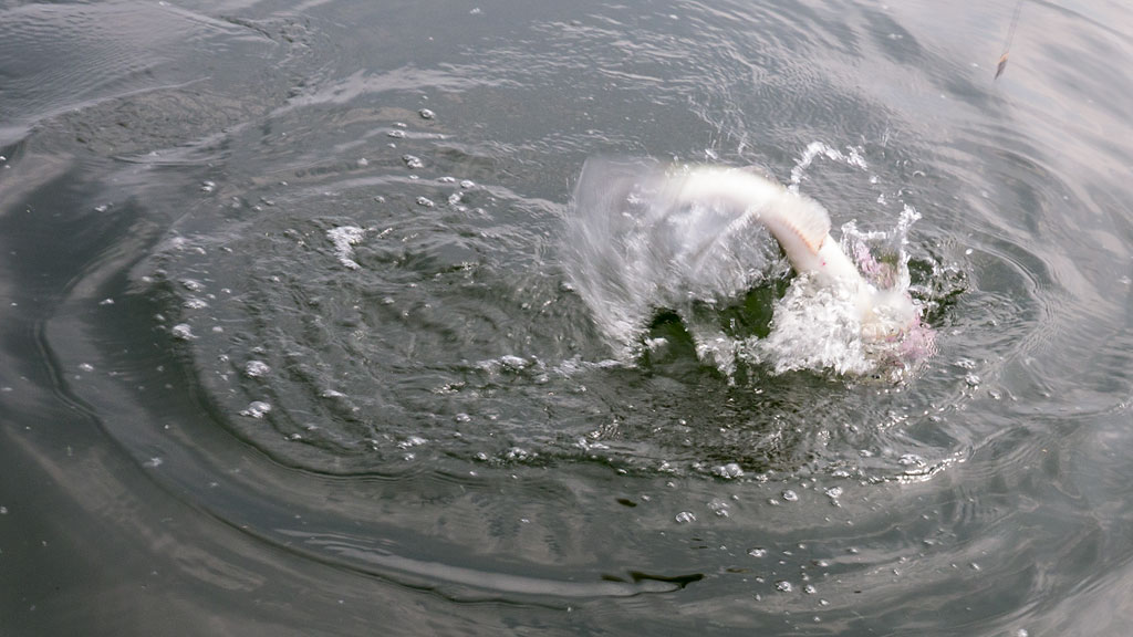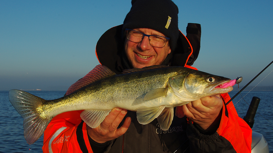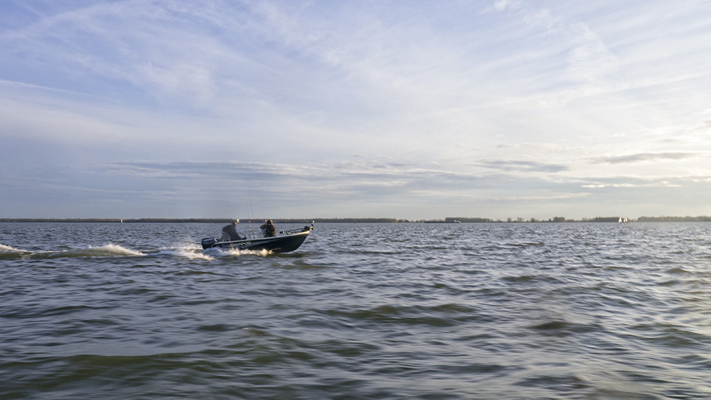 Wit licht op de boot en we scheurden in de schemering naar de overkant. Tranen in de ogen én emotie. Het opkomende licht op het grote water is altijd intens en je wordt er door gegrepen. Op de eerste stek kregen we al werpend geen tik en we voelden het als een slecht voorteken. Zou de vis niet meer ondiep liggen, komt er toch nog winter? Vorige week was het water nog bijna twee graad warmer… en ik ving ze zeer ondiep…