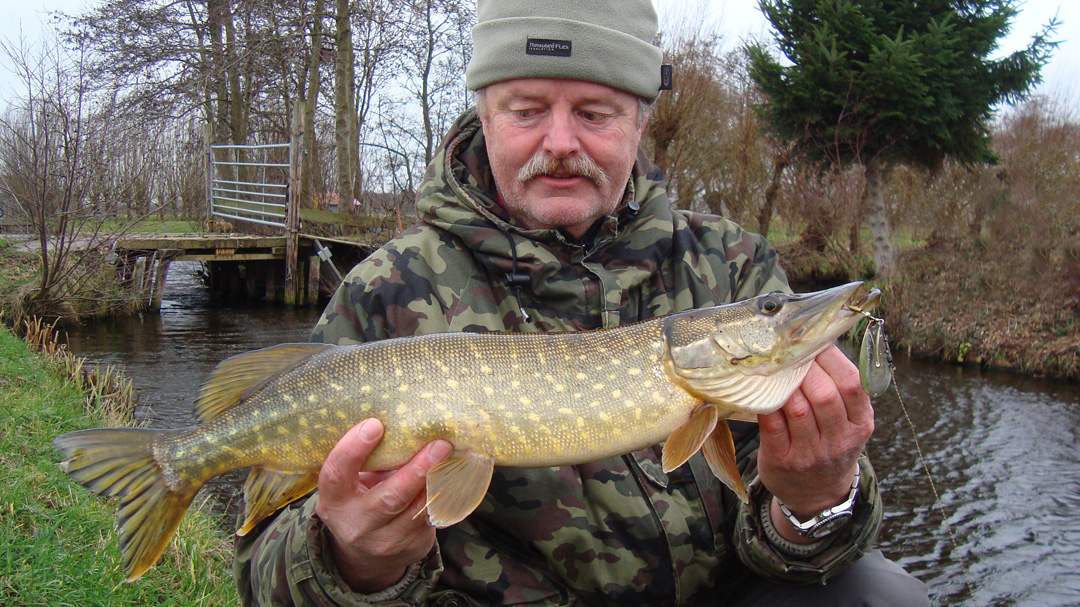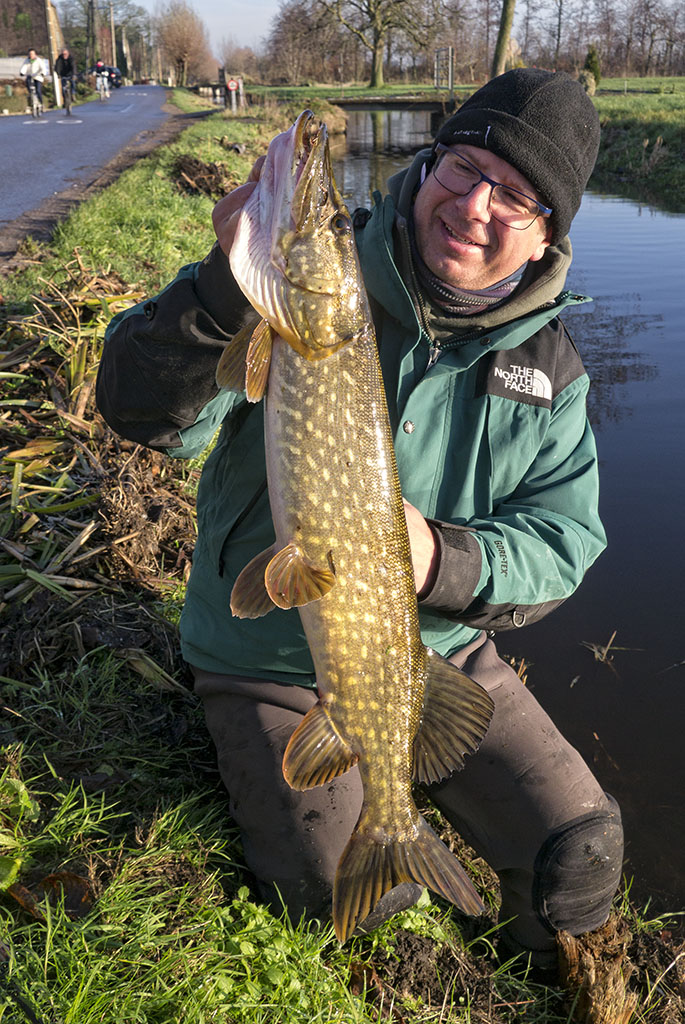 Maandag reed ik met Fons mee, naar ‘onze’ polder. Guur polderweer was het. Donker, felle wind, horizontaal dwarrelende bladeren, en een weinig regen. Héérlijk. Fons leeft op met zo’n weer, dat zie je. Hij kan niet wachten om te beginnen, hij ademt de polder! Terwijl ik de shad met mijn eerste worp (ander setup dan gewoonlijk, kuch) in de struiken aan de overkant parkeer haakt hij al z’n eerste snoek van de dag. Ik neem een foto en mompel dat het een topdag wordt, dit kan gewoon niet misgaan. En ja, we doen een hele wandeltocht door de polder en met tussenpozen krijgen we plenty actie. Erg leuk. De regen blijft uit en dat maakt het extra tof. We sluiten de dag voor donker af met een kleine twintig poldersnoeken. Geen monsters, maar prachtige goud en donkerbruine rovers.
