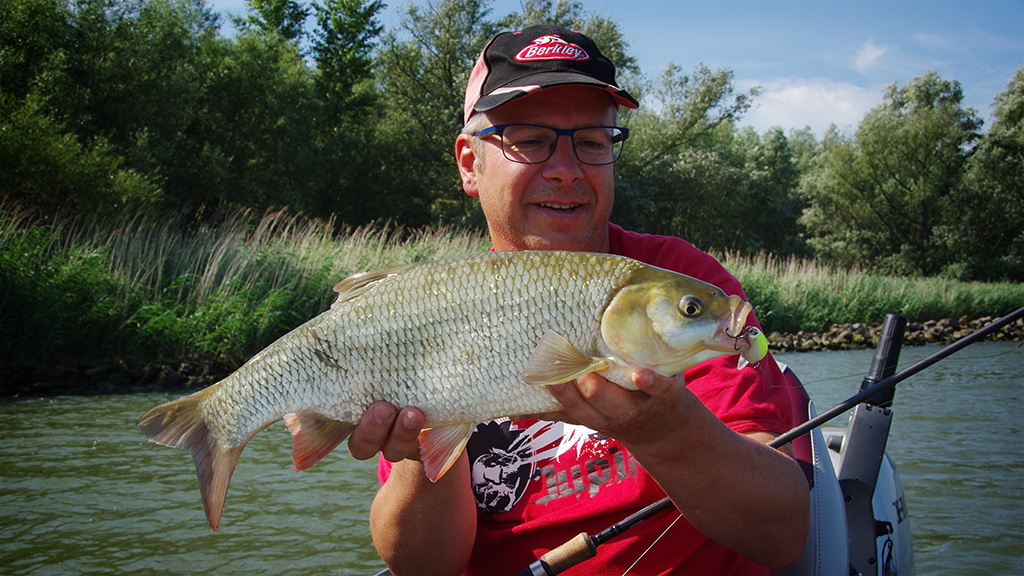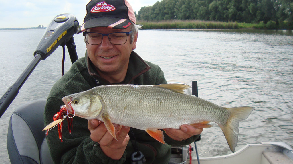 In de voormiddag vond ik mijn stekken visloos, althans ze deden het niet. Een paar kilometer verderop ging het wel los en kon ik op korte tijd acht vissen landden. Kort uit het water, een paar snapshot, wat een hitte! Ik zag m’n tweede roofblei uit het diepe komen en keihard op m’n spinnerbaitje knallen. Héérlijk! Wat zijn die snel zég! De mooiste vis van de dag was een baars van 45cm, al mooi op zich. In de namiddag viel de actie compleet stil en naar de avond toe dobberde ik doelloos en hallucinerend rond. Stop! Inpakken dan maar. Glimlachend en gaar, een stukje bruiner, en onder het aanhoren van een CCR-cd cruisde uw broeder in Petrus huiswaarts. Dit weekend niet voor herhaling vatbaar!…