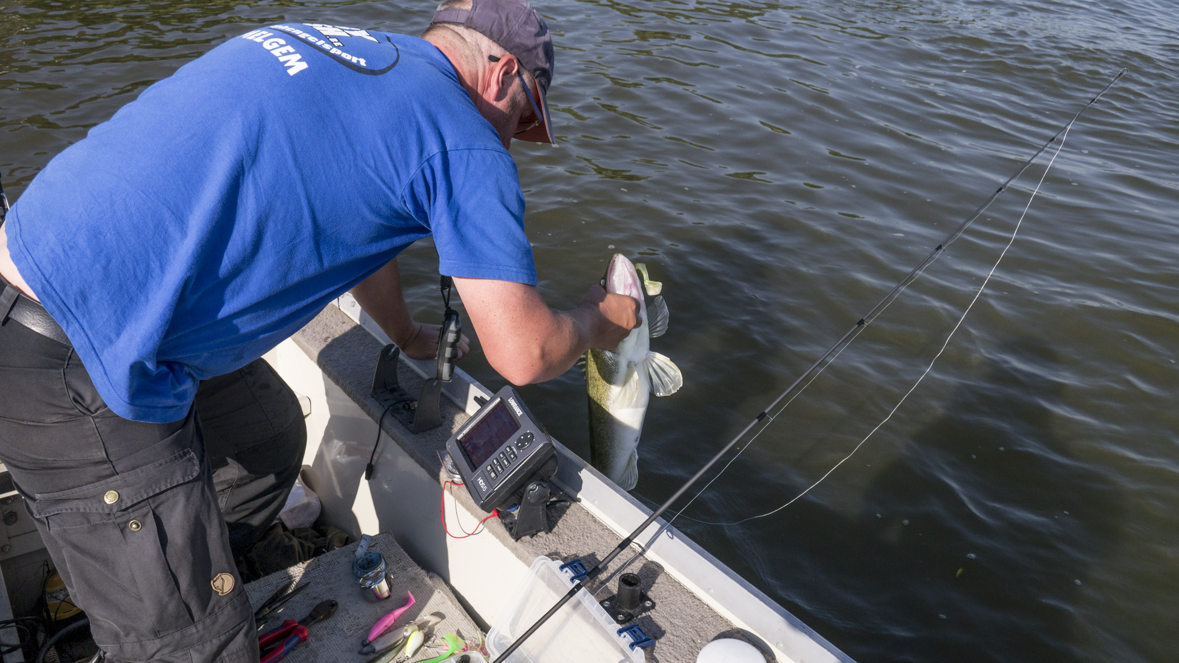 Even later moest zelfs een klein snoekje gered worden door de twee dreggen van een Fat Rap door te knippen. Leuke snoekbaarzen en tonronde baarzen. Hé, en daar kwam ook een topper binnen, een evenaring van m’n huidige PB. Eerlijk gemeten. Op naar de vijftig dus, in het jaar dat ik vijftig wordt. Tijdens het fotograferen van een dikke vis lag Marc ‘Mutske’ met de borst over de rand van de boot, een actiebeeld van het terugzetten. Plots knapt er iets en hij schreeuwt het uit van de pijn. Ik dacht dat hij een hartinfarct had. Buiten gejammer kwam er niks verstaanbaars uit… Teveel druk op één punt van z’n ribben… Dat is een gebarsten rib, denk ik… Dit is dan ook de eerste baars die zorgt voor een inwendige kwetsuur! 🙂