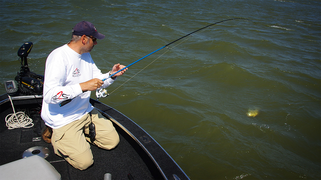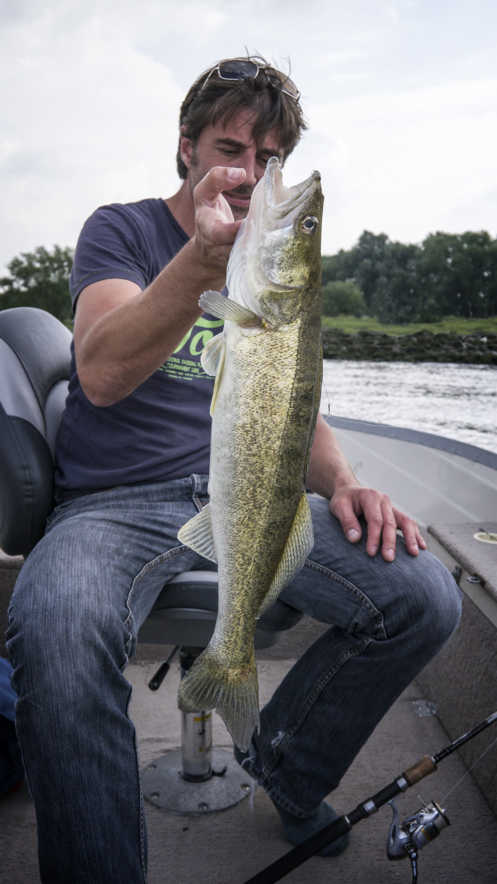 Toen we alsnog een stukje vertikaalden kreeg ik de spreekwoordelijke Kers op de taart, een snoeiharde aanbeet op een Finn-S op 7 meter water. Het ding ging er nogal vandoor en hing zwaar in het St. Croix-hengeltje. Duidelijk een betere vis, Fons gokte op een erg grote snoek. Op 8/00 dyneema is een ongeluk zo geschied dus geconcentreerd drilwerk was nodig. Niet eenvoudig in een hard stromende rivier. De fronttroller stak niet in het water, daar was het te laat voor, en met een backtroller is het intens corrigeren als je een zware vis aan de lijn hebt tussen de kolkende kribben. Uiteindelijk gaf deze meerval het op, haalde ik mijn duim flink open aan het tapijt tandjes en kon het beest op foto. Toch iets speciaals, deze meerval. Alleen, het is niet best voor het tapijt in de boot! Wat een slijmerd…