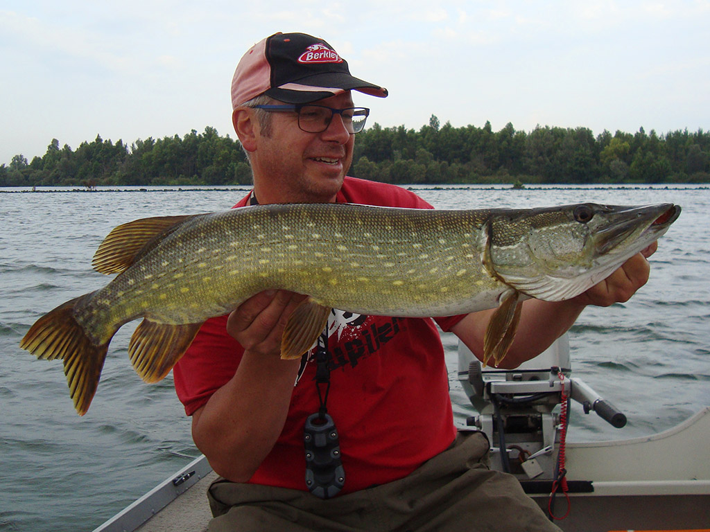 Vrijdag was Marleen er terug bij, het werd bloedheet en windstil. Urenlang kreeg ik geen visje te zien om in de late namiddag twee keer in een uur een grote snoekenvrouw te missen. Boven zeven meter water weigerde deze bleke vis eerst een shadje en daarna ook nog eens m’n spinnerbait. Het leek me of deze vissen het spelletje zeer goed doorhadden en vooral bang waren van m’n boot. Weeral een prachtige kans gemist en wat verderop sloot ik de dag af met een zeventiger. Héél wat pech dus, deze keer.