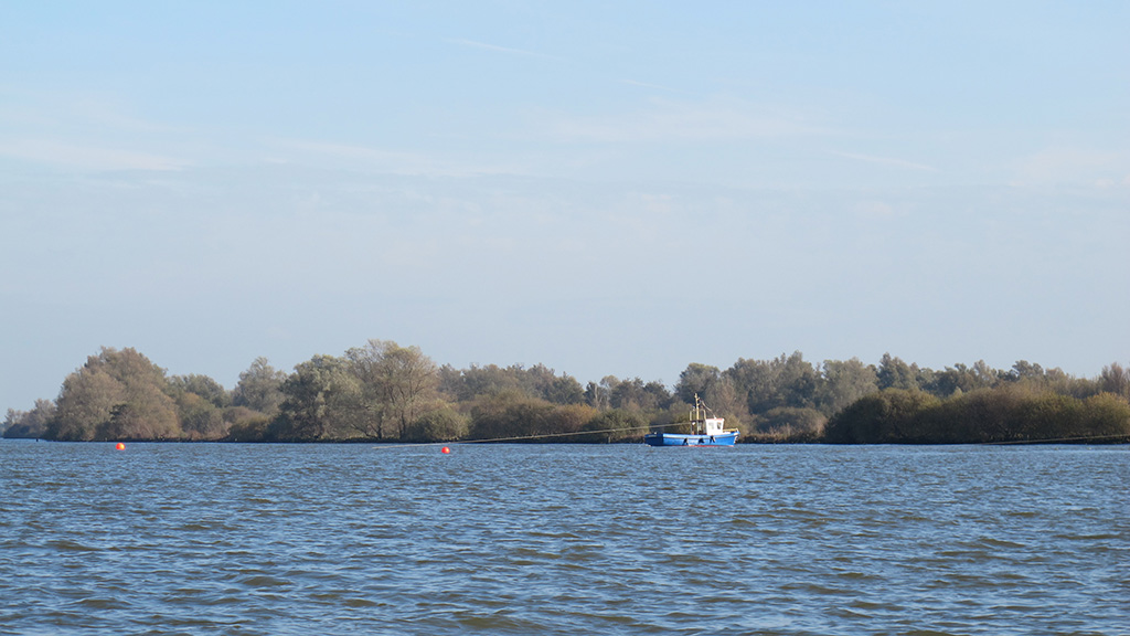 Gisteren was ik aan het vissen op het Hollands Diep ter hoogte van Strijensas, toen aan de overkant aan het eiland een beroepsvisser een zegen kwam trekken.