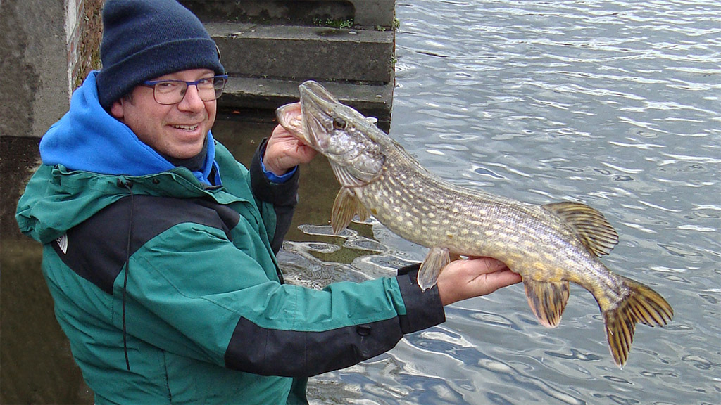 De werken aan mijn filterput van de vijver zijn deze namiddag afgerond. Alvast één zorg minder. Deze avond gaf het weerbericht regen, slecht weer. Om 15u30 dacht ik om er toch nog eventjes tussenuit te knijpen om een snoekbaars te tikken. Ik zit dan wel even in de auto en het begon al te regenen. Mooie korte wandeling en aan het water ging ik op zoek naar de bel aasvis die ik hier vorige duidelijk voelde. Rikketik, tik, tik zegt je lijn al je door een school heen vist. Deze keer lagen de school visjes iets verderop. Ik tikte er een Salt Shaker door en na een half uur had ik twee mooie donkere snoekbaarzen en deze snoek. Gelukkig zat de shad vooraan in de bek, 2 cm dieper en ik had deze vis verspeeld. Tijdens de dril spuwde ze twee voorntjes uit. Prachtig zicht. Ik ging languit op het beton liggen om de vis met de kiewgreep te landen, het lukte en een vriendelijke passant -die ook wel eens viste met z’n overleden broer- nam een paar foto’s. Hij vond het wel eigenaardig dat ik vis niet dood tikte en ze zo snel liet zwemmen. Zo hoort het ook. Geen uur gevist, doorweekt aan de voorkant en al terug naar huis… Hit and run, we say.