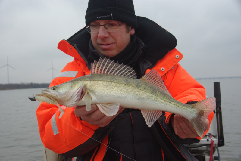 Ook is het erg leuk vissen drillen met één van m’n nieuwe St. Croix stokjes. Een puik en strak hengeltje voor een klein reeltje, in dit geval een Abu ProMax. Iedere trilling word mooi doorgegeven naar m’n arm en zelfs met dikke handschoenen aan heb ik goede voeling met de 21 gram die tien meter lager hangt in de volle stroming. Marc viste vandaag vooral met z’n Culpritjes (ik denk dat hij er mee gaat slapen), en een paar creaturen die ik nog niet in m’n assortiment heb wegens te obscuur! Ik was vooral aan de slag met standaard Fin-S, met Salt Shakers in verschillende kleurtjes, en met dat populaire witte wormpje zonder naam uit de Goudvoorn… De beten waren hard en ik voelde het geweldig. M’n boterhammen raakten zelfs niet op, zo geconcentreerd visten we onze dag uit. De teller stopte op twaalf snoekbaarzen, zeven voor Marc en vijf voor mij. Nog altijd een off-day volgens Marc, ‘alhoewel goedgemaakt’. Net voor donker trailerden we de boot en haastten we ons om de motor en de boot niet te laten bevriezen. De autoverwarming stond wel degelijk op verwarmen en druk nakeuvelend bromden we huiswaarts. Thanks, Marc, ook voor je foto’s! Enkel de korte file in Antwerpen was teveel aan deze erg toffe dag!…