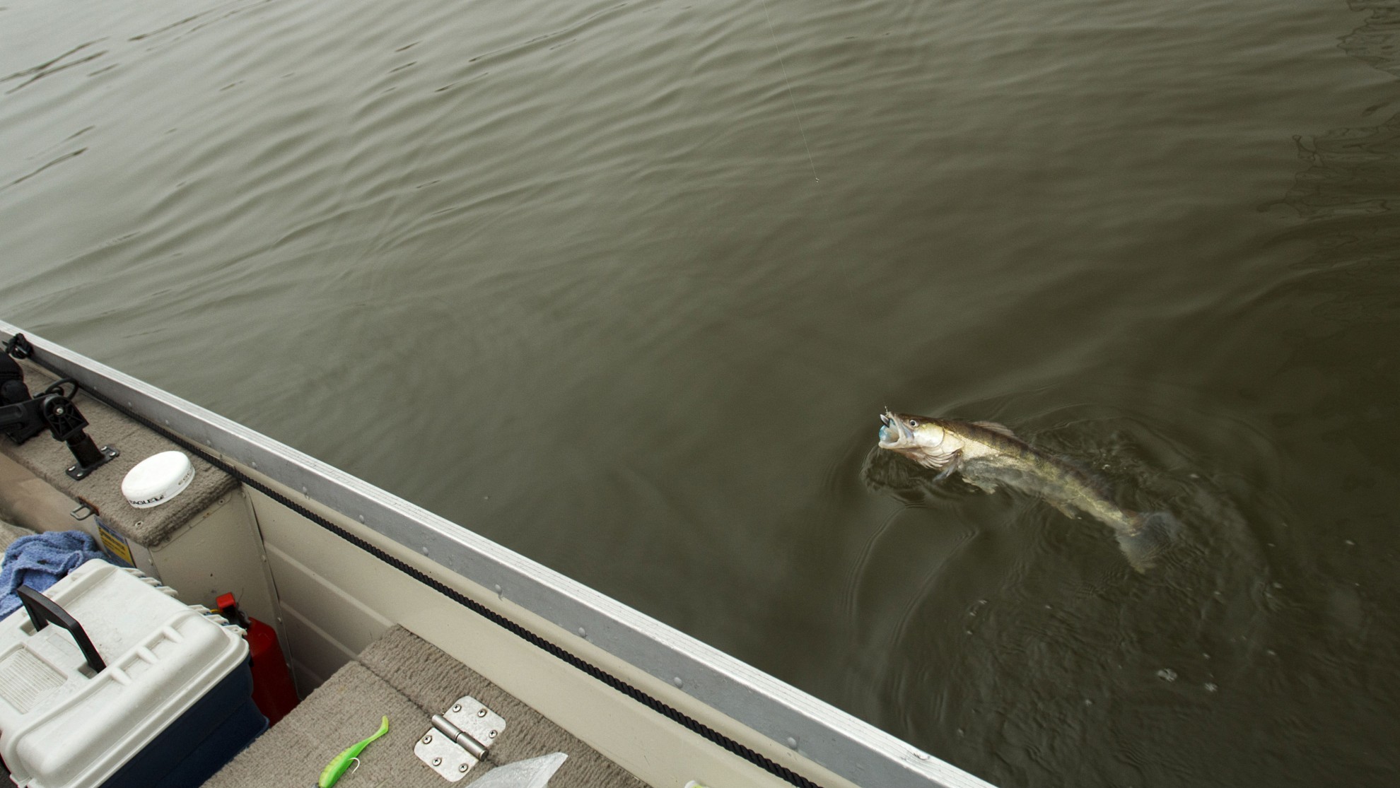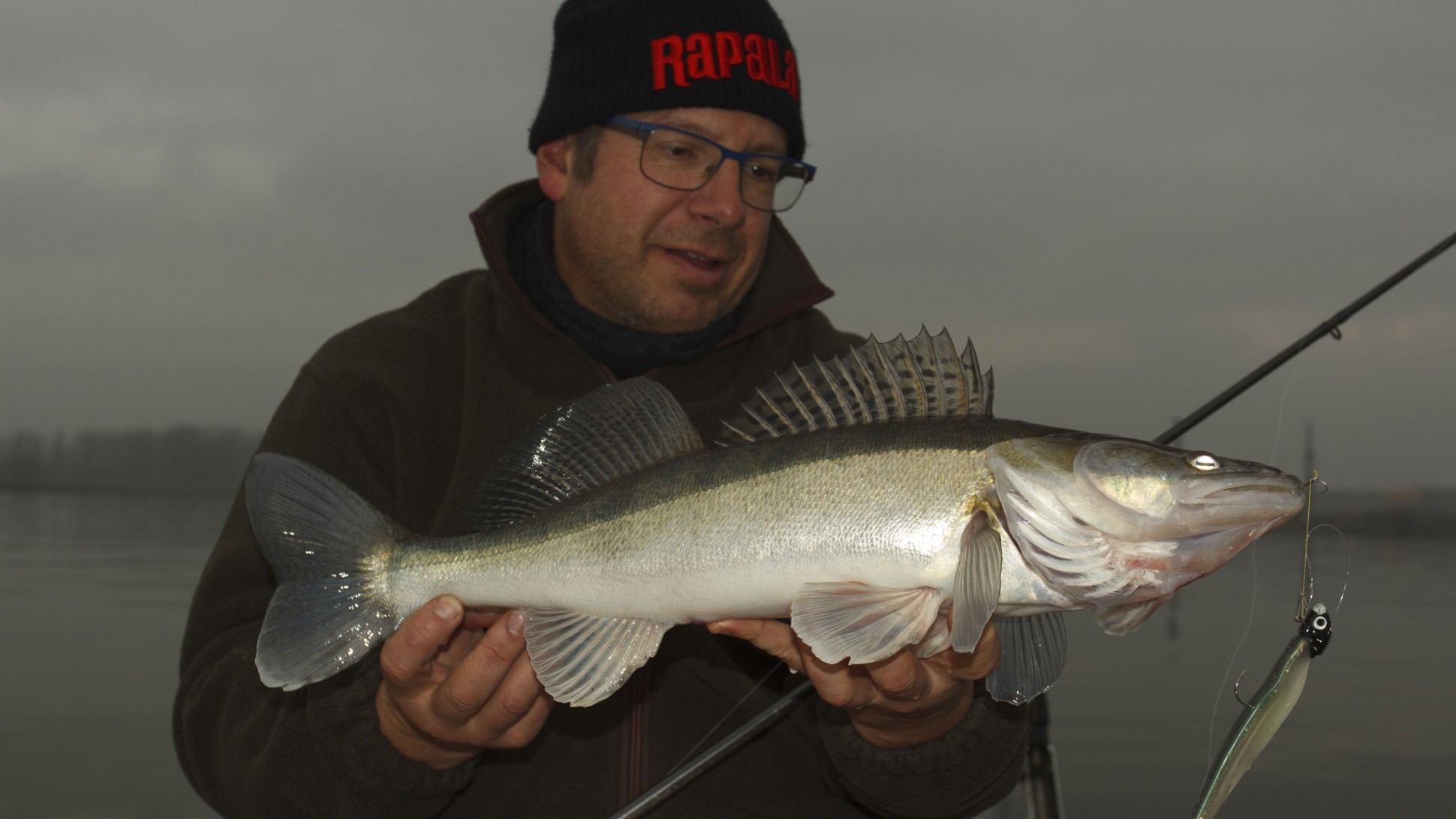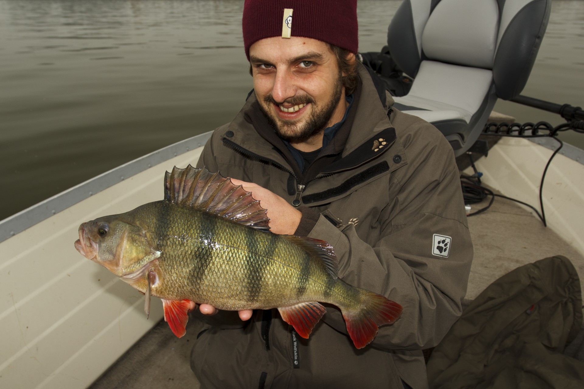 De vissen lagen nog op de diepte van vorige week en ik had ook een aantal nieuwe shads ingeslagen. Kleur wit-blauw. Iets wat ik niet veel gebruik maar Fons overtuigde me. De eerste stek gaf niet veel vis present dus sjeesden we zonder tijd te verliezen een eind verderop. Daar was het wél raak maar we verzeilden in de kleine vissen. Dat is plezant voor iemand die het vertikalen nog niet echt doorheeft maar kleintjes trekken hoeft voor mij niet zo. Op de volgende stek had ik last van golfslag en die liet ik vlug links liggen. Op de volgende stek in de luwte kwamen de aanbeten trager maar waren het iets leukere vissen. Het werd helemaal mooi toen Jens een mooie baars aantikte. 45 cm is naar onze maatstaven een grote baars. We heten niet allemaal Marc Hoeben! Jens was er dolblij mee…