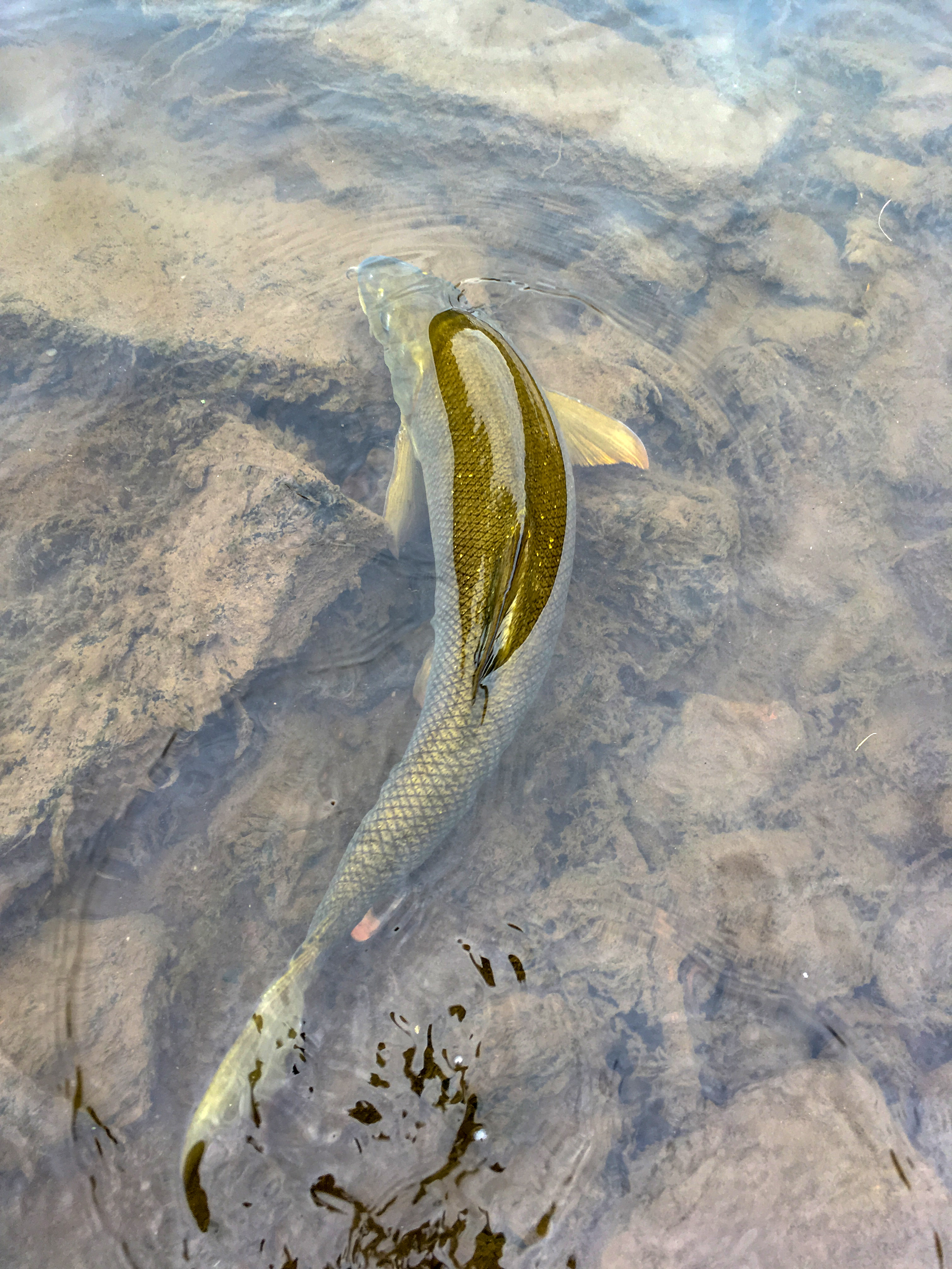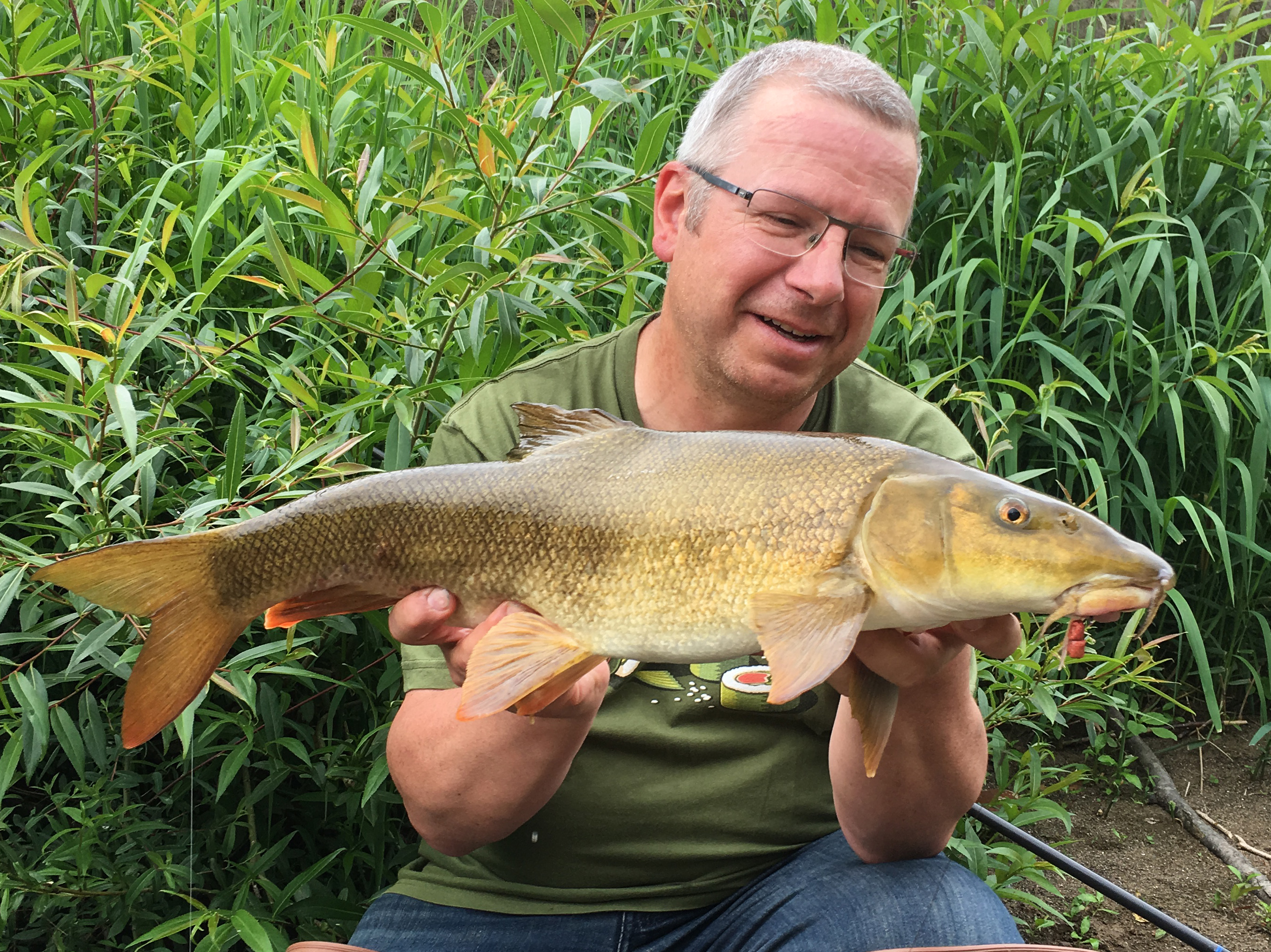 Nog steeds geen zin om in de rij te gaan staan aan de trailerhelling, ‘t is eens tijd voor iets anders!… Op de één of andere manier heb ik het op dit moment wat gezien met het bootgedoe. We varen mekaar bijna builen op het water. Had dringend nood om iets anders te doen en hoewel ik al enige barbelen gevangen had in het verleden vond ik het nu een mooi moment om hier een tijdje voor te gaan. Ik had m’n huiswerk gedaan, had vertrouwen in het aas en zonder enige goede stekinfo had ik maar een paar stekken via Google Maps aangetikt. Enige vliegvis-ervaring kan daarbij helpen. Lage maar niet te lage waterstand, met de Poloraid kon ik de diepe stukken ontwaren en daar kwamen ook de eerste twee vissen vandaan. Man, man, wat zijn dit raketten! Als de vlagzalm ‘the Lady of The Stream’ genoemd word, dan noem ik de barbeel ‘The Hulk’! Op de volgende stek zag ik ze in het flauwe zonlicht draaien in de lome stroming, met wel 10 te samen. Eén korf er net vóór deed ze in het niets verdwijnen en ik moest daar toch een goed half uurtje wachten voor de volgende zestiger op de mat kwam. Kort daarop had ik een bruin forelletje, ik zag ‘m zichzelf vastprikken, zeer bizar…
