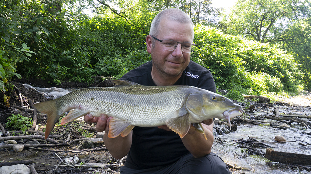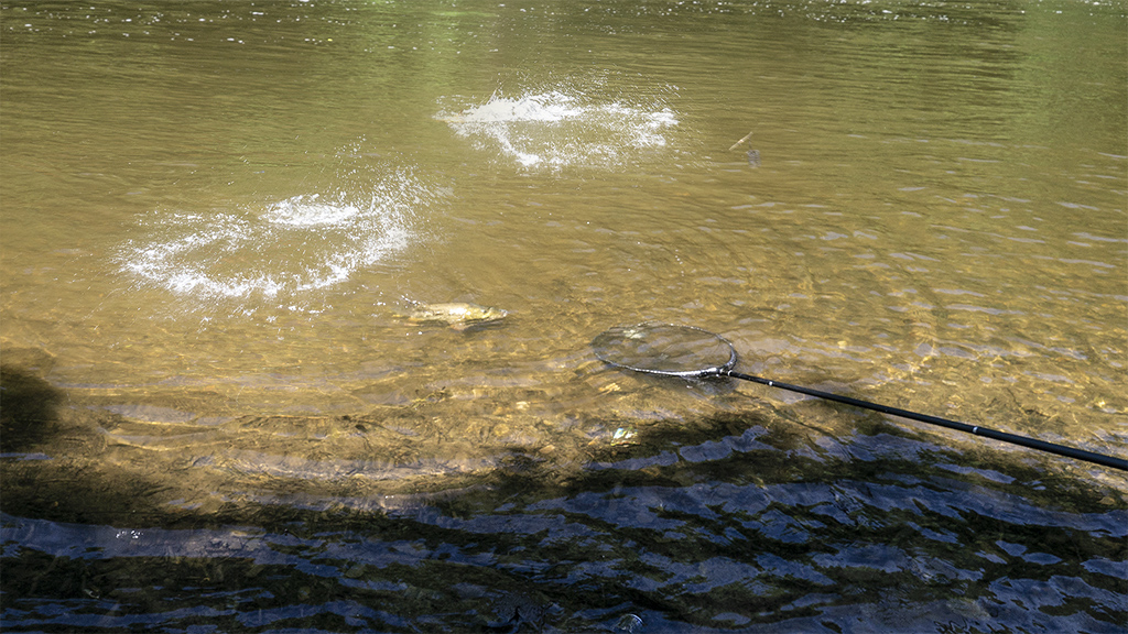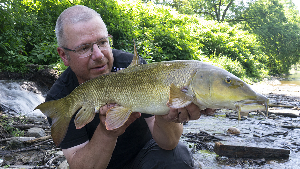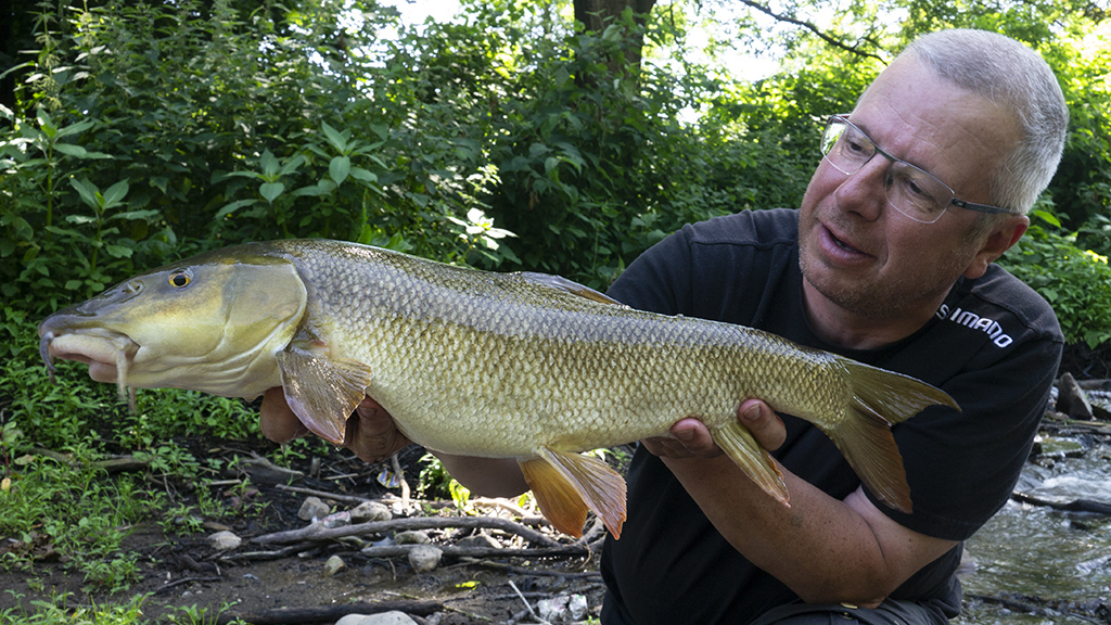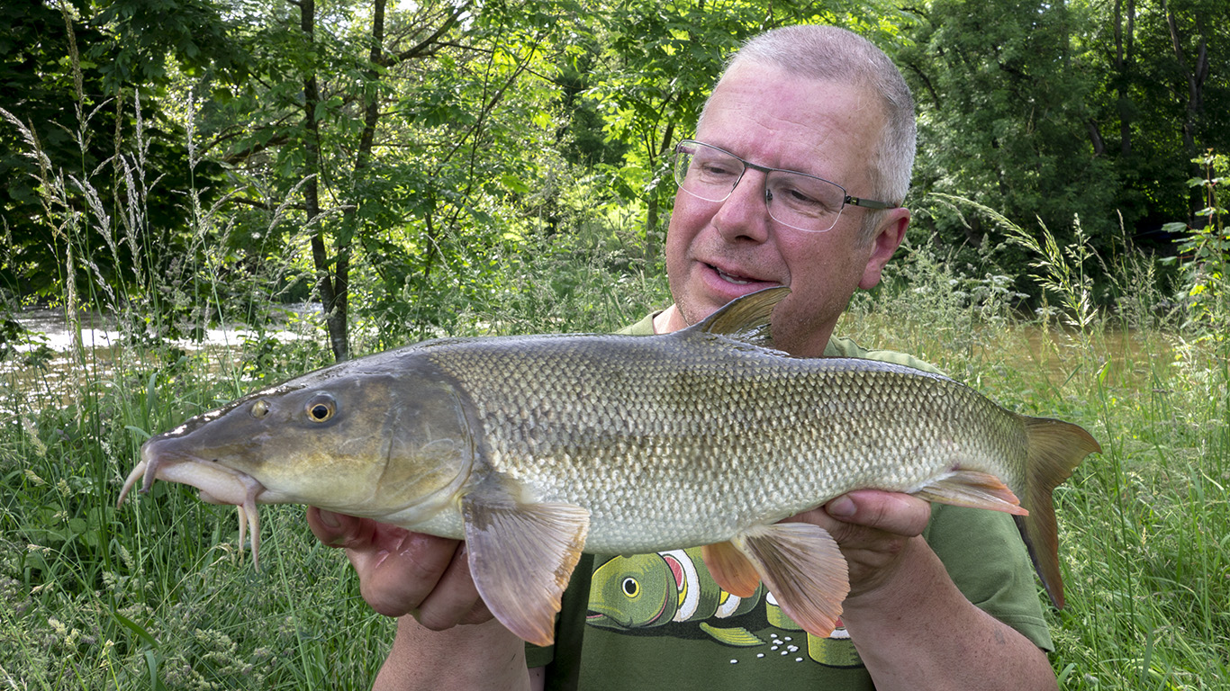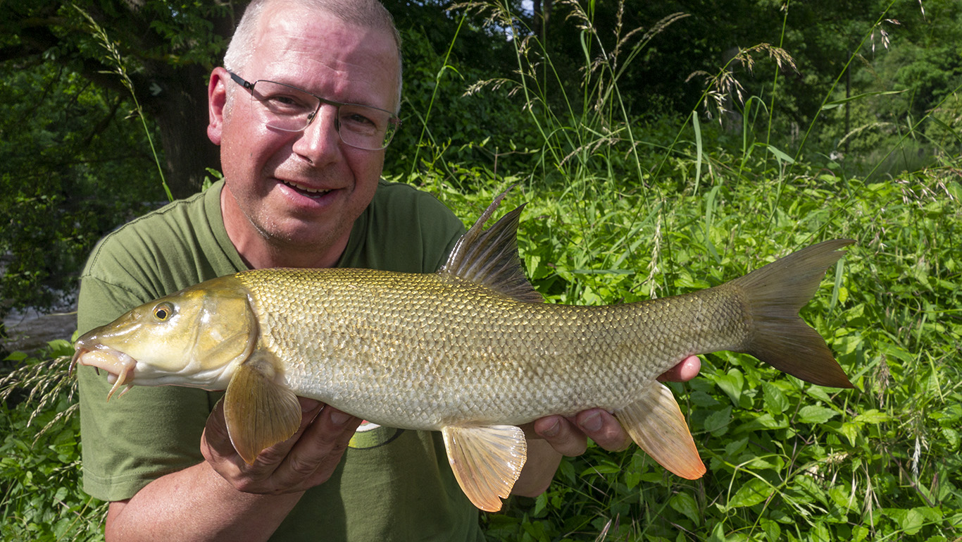 Een hele voormiddag zonder actie. Net toen we honger kregen en op punt stonden om weg te gaan kon ik nog aanslaan op een weifelende aanbeet. Een medium barbeel kwam in het net. Niks in vergelijking met gisteren maar de eer was tenminste gered. Had ik er toch nog eentje voor de foto…