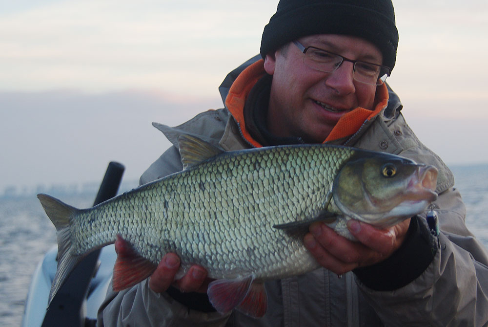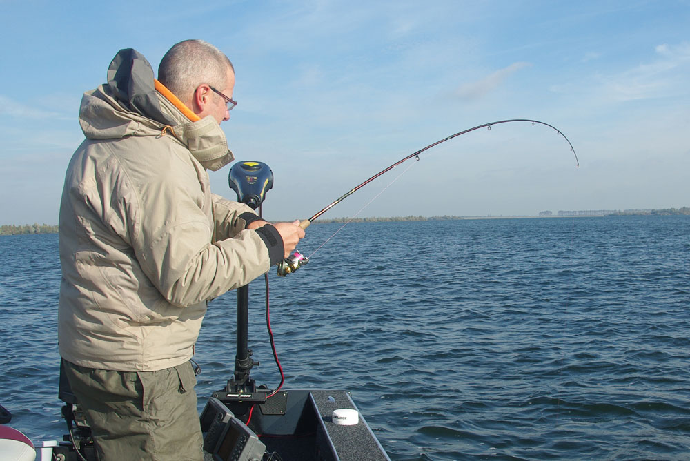 We waren al met zonsopgang aan een groot Nederlands water. Ik zat alweer te suffen, het hard werken aan Alijn’s boek weegt op m’n gestel. David zette in met kunstaas, ik met een medium-size horsmakreel. Ik werd vlug wakker want in het eerste uur kwamen er vlot een aantal beten, waarvan er een drietal werden gelost. David verspeelde een kleintje én een mooie vis. De vis die ik loste was een beste, dat voelde ik zo. David verzilverde er twee, een leuke 89-er en een hard vechtende vis van 101 cm. Dus, weeral een metervis binnenboord, de dag was weer al prima ingezet en het was niet eens middag. We gingen op zoek naar meer. We vonden verderop verschillende scholen aasvis en we visten er kriskras doorheen. Midden een school brasems (David haakte er trouwens eentje op pijnlijke manier op z’n kunstaas) kreeg ik een droge tik, mepte, en een halve horsmakreel kaatste op het oppervlak terug… net achter m’n dreg netjes afgebeten. Spijtig.