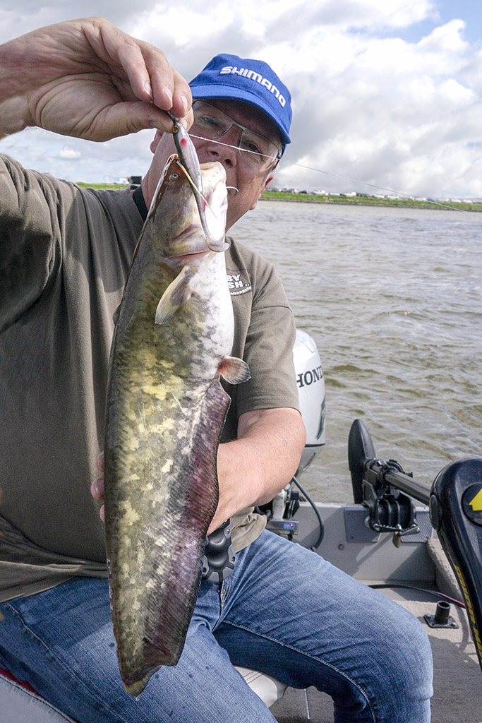 Flanders Fisher wilde wel eens van het bootvissen proeven, ik had het al zo lang beloofd om hem eens op sleeptouw te nemen. Wat een hete en slechte visdag. Niks te vinde, op een flinke baars na. In een wanhoopspoging besluiten we wat te vertikalen op een bult waar ik wel eens een mooie snoekbaars tik. Het duurt daarmaar even voor Wim de goedmaker van de dag aantikt. Ik verwacht een beer van een snoekbaars maar het geweld vertaalt zich in een metersnoek. Oooo, wat was ie blij! We visten nadien nog vruchteloos door…