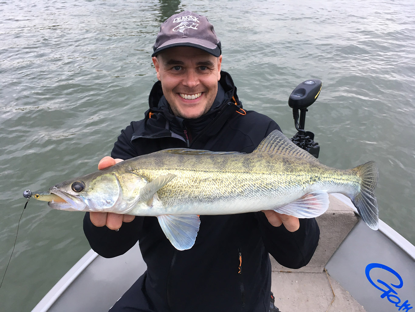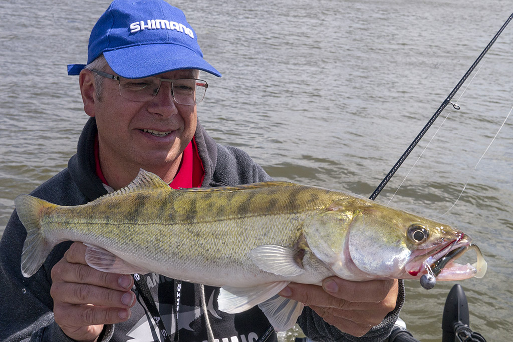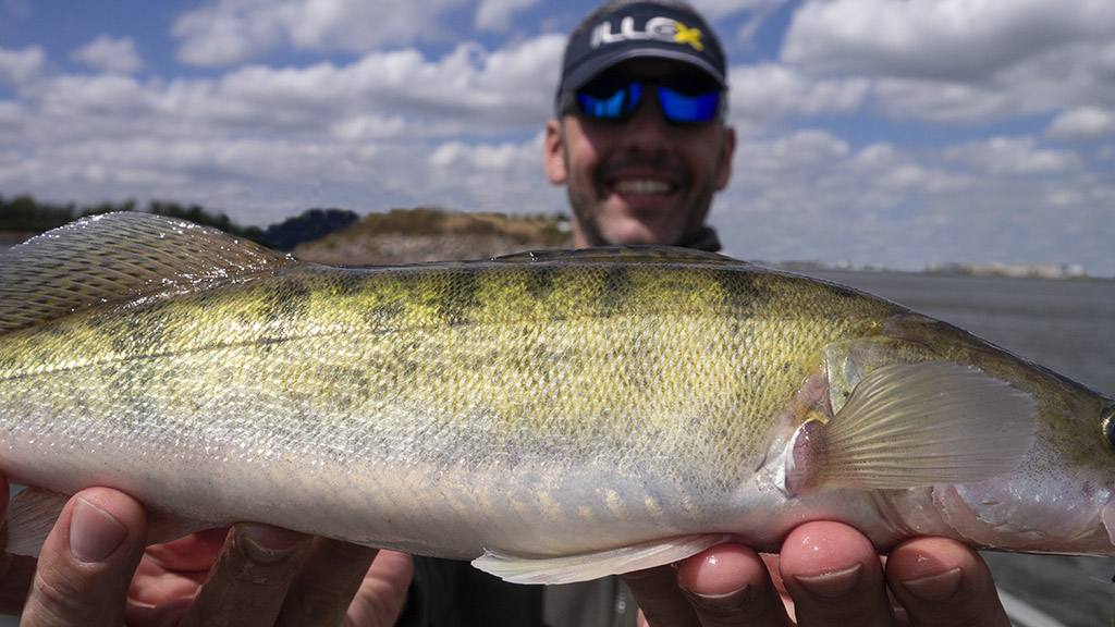 De laatste keer dat ik hier viste is reeds meer dan een jaar geleden en dat was toch weer wennen. Johan Jespers was ‘deckhand eerste klas’ en we hadden afgesproken om eerst wat te vertikalen en nadien te werpen op de taluds. We waren geen 50 meter ver of de eerste snoekbaars diende zich aan, dat beloofde! Er volgden er nog een rits, plus een paar snoeken en een roofblei, het kon al niet meer stuk. Tegen de middag aan zochten we meer beschut water op en toen viel de actie weg. Niet toevallig samen met de stroming… Gezellig, zo zittend in het warme zonnetje maar als ge niks meer vangt dan moet je op zoek. De driftzak bracht soelaas en stond toe om een lange gecontroleerde drift te maken. Dwars over een stek waar ik nog nooit gevist had. Het zag er op de kaart wel erg goed uit. En hop, Johan kon z’n grootste snoekbaars ooit verwelkomen! Het is geweldig om dit met je vismaten te kunnen delen! Hij was er erg blij mee! Je nieuwe hengel, reel en je favoriete Jespiblade-shad 😉 zijn hiermee mooi gedoopt op dit grote water!