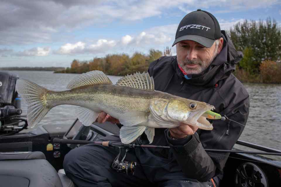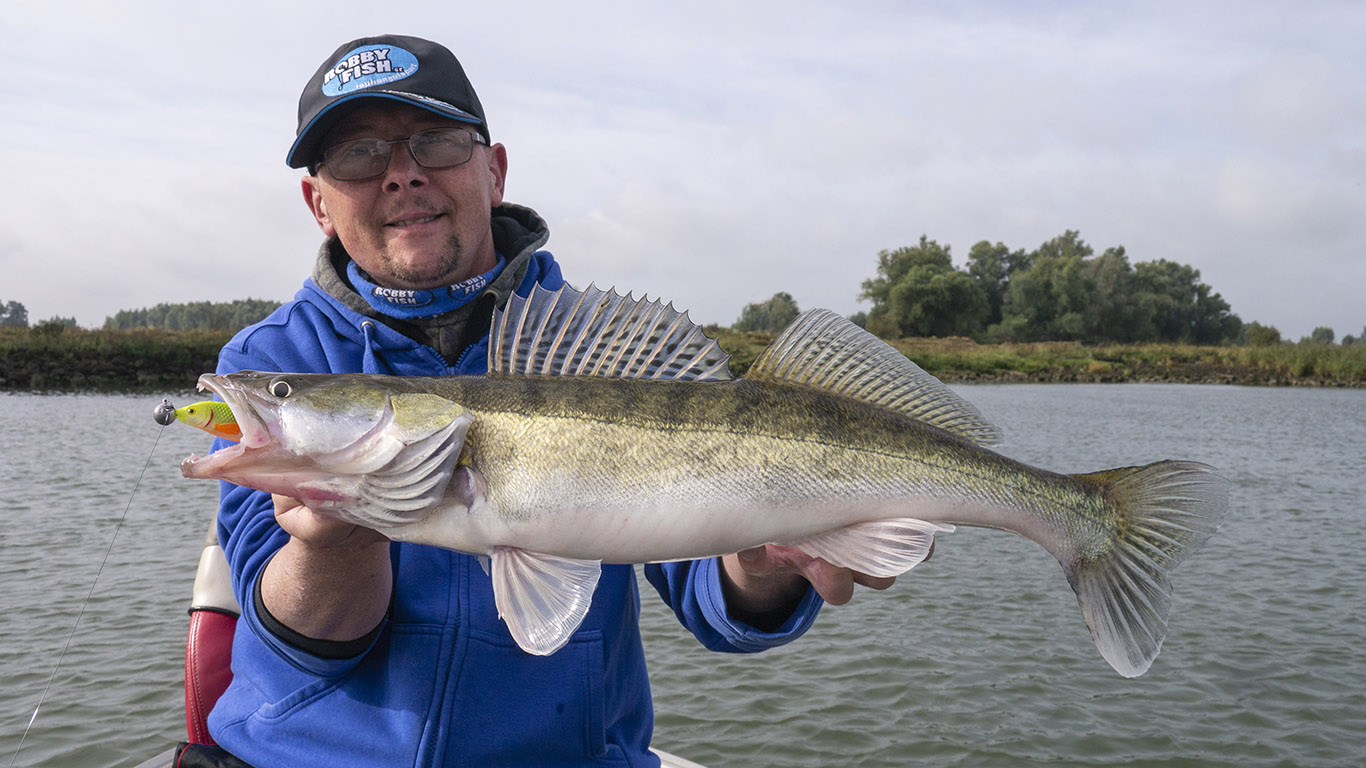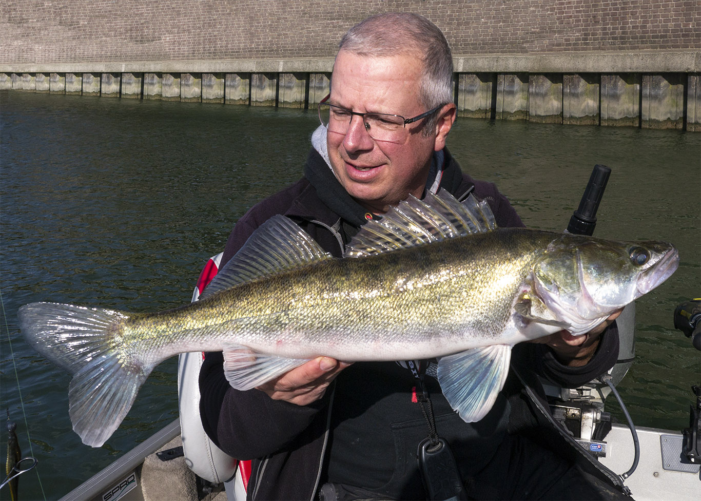 We waren pas 50 meter ver gedrift als Robby Fish-collega Frans Wijns enig lawaai produceerde, hij had verdorie reeds eentje een oor aan genaaid! We hadden een snoekbaars verwacht maar deze vette baars verbrak Frans’ PR met z’n 48 cm! Héérlijk, wat een begin van de dag! Monter ging hij verder met het bestoken van de kant, je zou voor minder. Even later brult hij: ‘Waaasda, waaaaasdavoriet?’ als ik een prachtige tachtiger over de reling trek. Allebei content dus. Hij slaagt er in om een uur later nog een eigen recordje te breken met een winde van 52 cm. Veel witvissers liggen wakker van dit soort vissen! Well done, Franski. We kletsten handen, zoals mensen die elkaar verstaan & op dezelfde golflengte zitten… Na de middag volgen nog een paar snoeken en een aantal medium snoekbaarzen, met z’n allen echter in de schaduw van deze 3 mooie vissen!