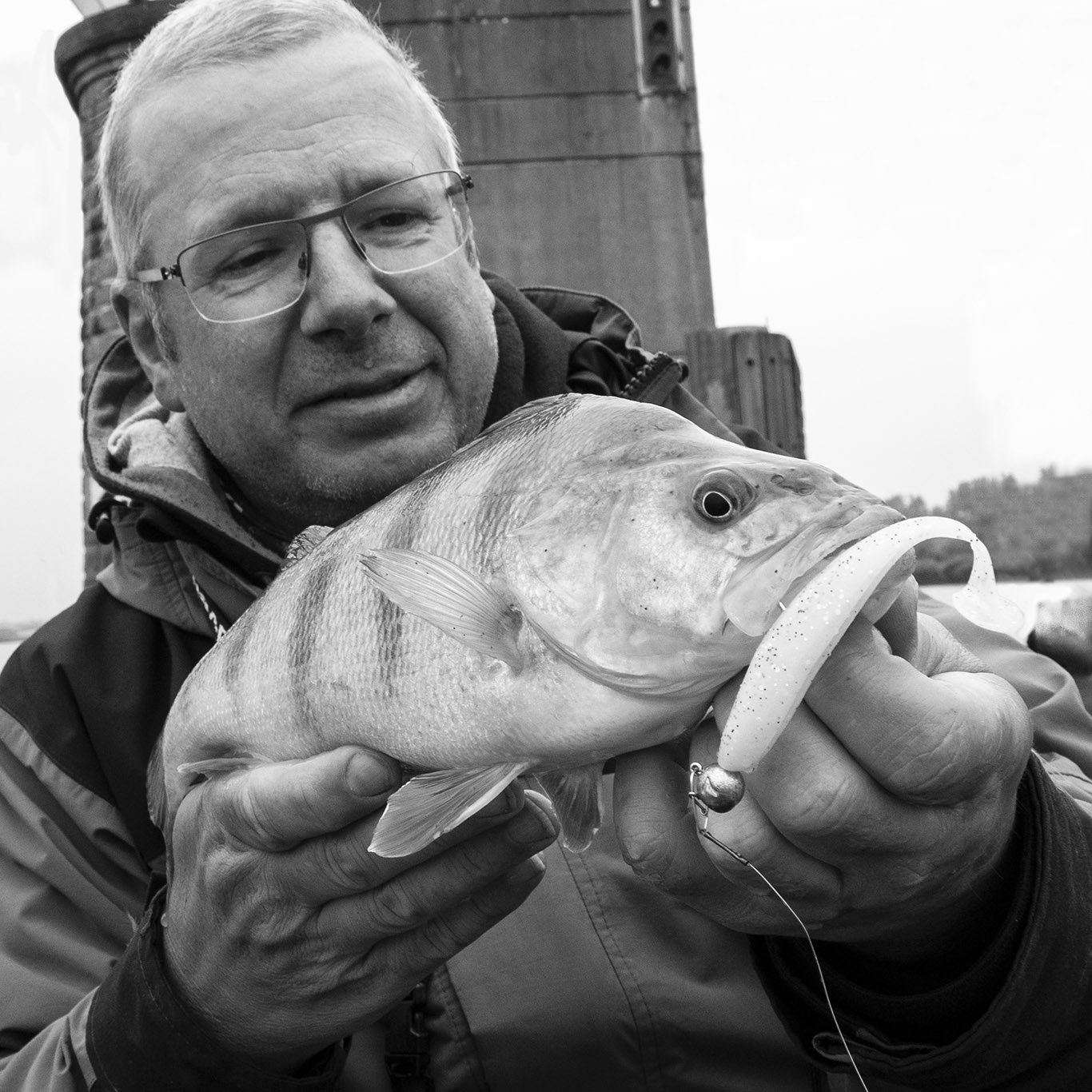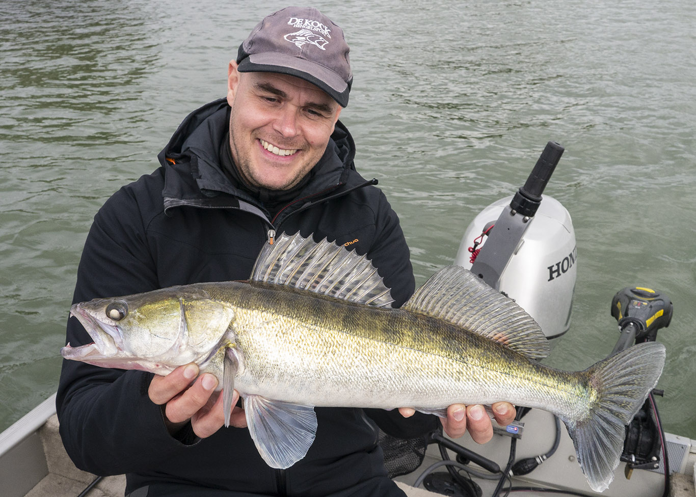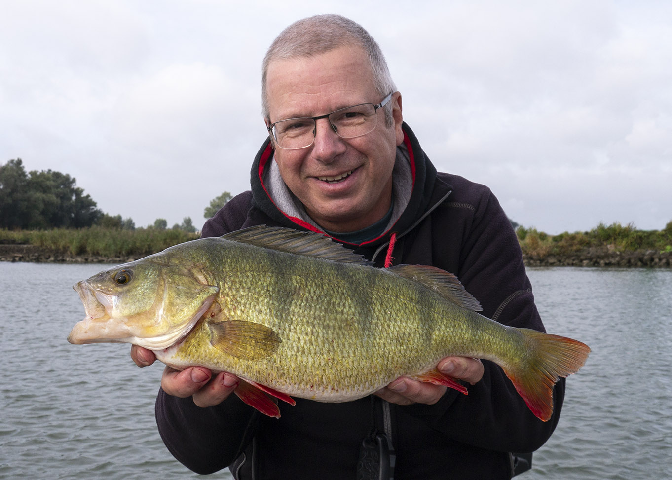 We waren pas 50 meter ver gedrift als Robby Fish-collega Frans Wijns enig lawaai produceerde, hij had verdorie reeds eentje een oor aan genaaid! We hadden een snoekbaars verwacht maar deze vette baars verbrak Frans’ PR met z’n 48 cm! Héérlijk, wat een begin van de dag! Monter ging hij verder met het bestoken van de kant, je zou voor minder. Even later brult hij: ‘Waaasda, waaaaasdavoriet?’ als ik een prachtige tachtiger over de reling trek. Allebei content dus. Hij slaagt er in om een uur later nog een eigen recordje te breken met een winde van 52 cm. Veel witvissers liggen wakker van dit soort vissen! Well done, Franski. We kletsten handen, zoals mensen die elkaar verstaan & op dezelfde golflengte zitten… Na de middag volgen nog een paar snoeken en een aantal medium snoekbaarzen, met z’n allen echter in de schaduw van deze 3 mooie vissen!