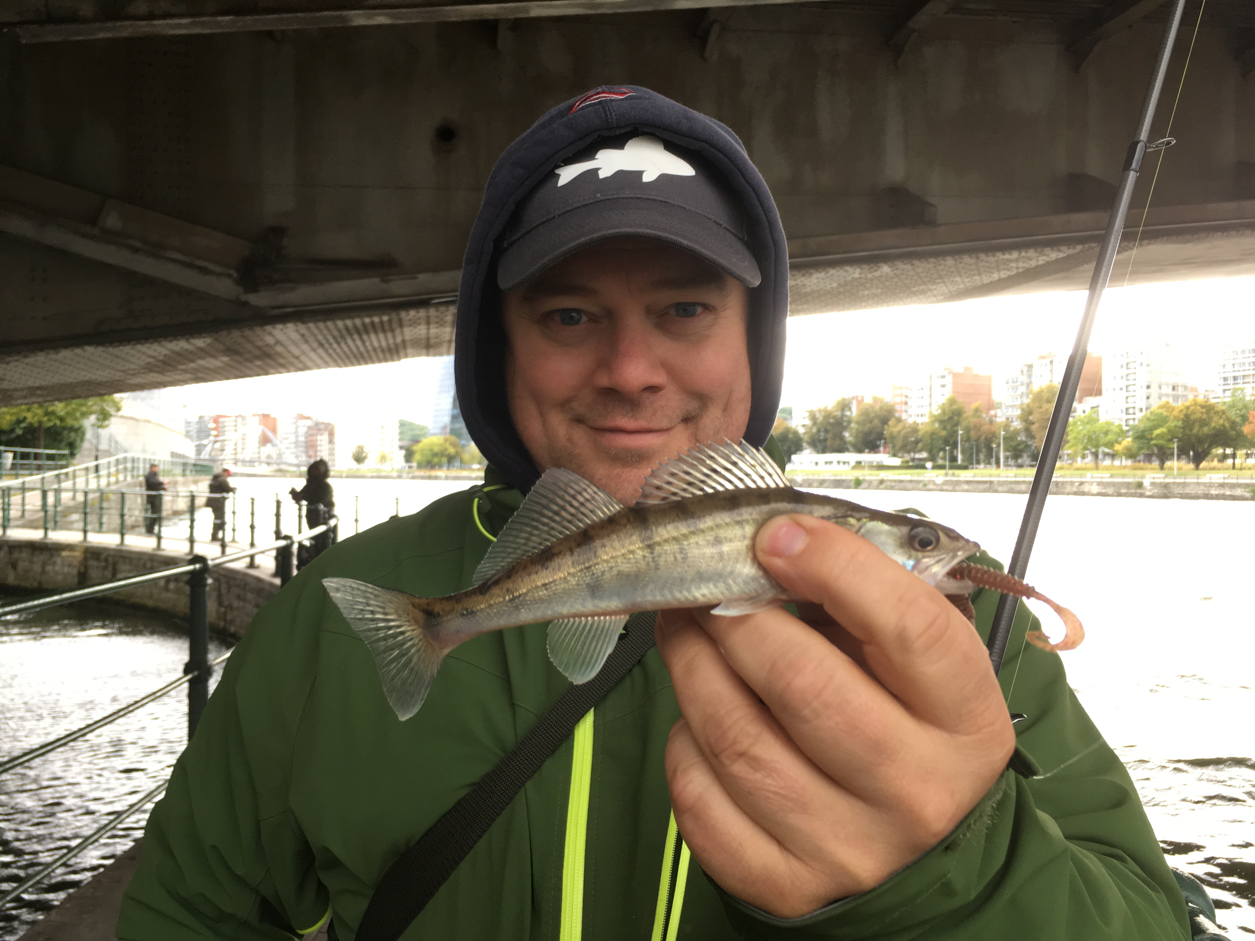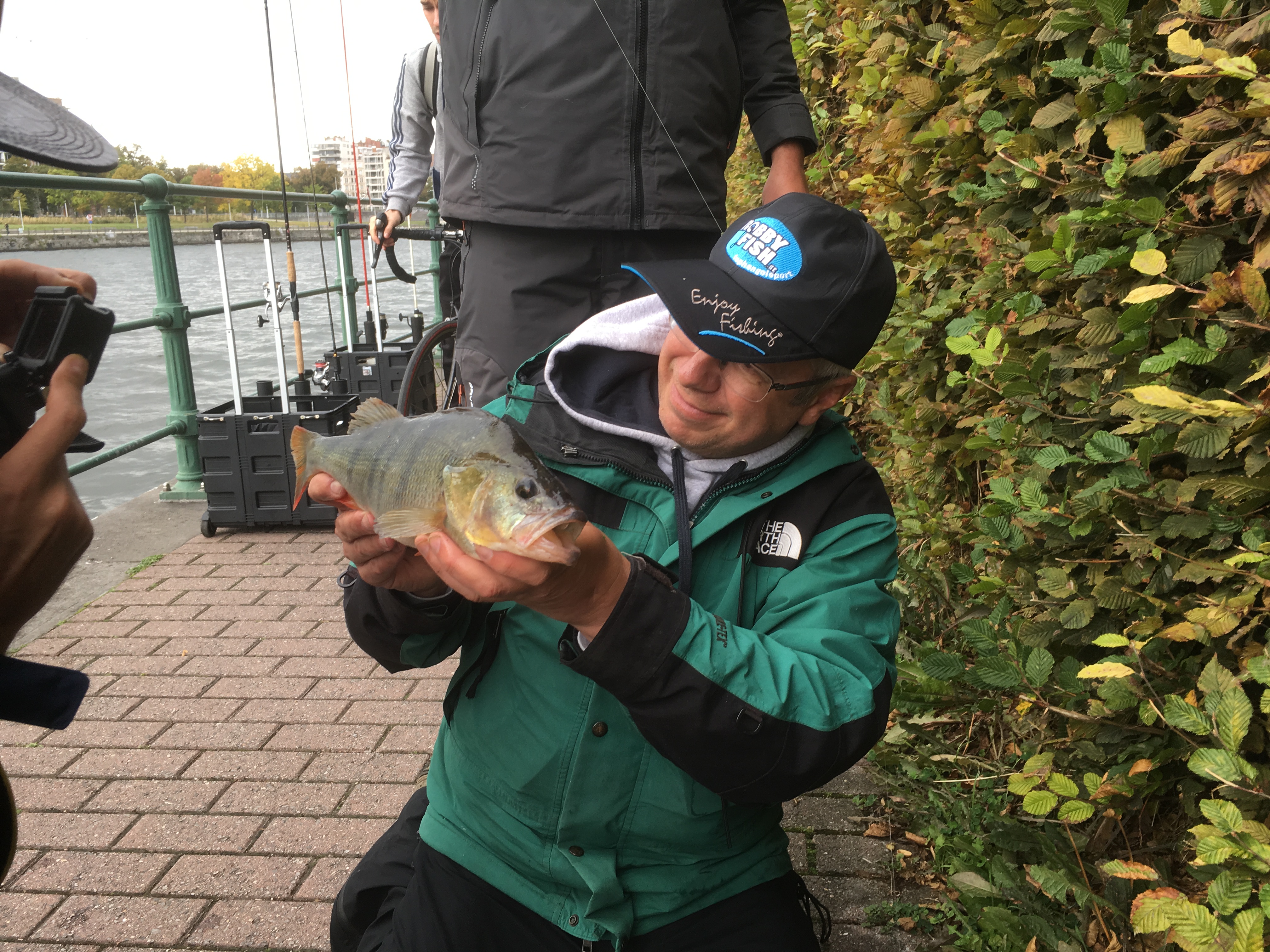 Zo trokken Bollie & Bruno vandaag met de trein de andere kant uit. Parijs (vorige week) was inderdaad wat ver, dat kon dus goedkoper. Voor dag en dauw waren we paraat, om Ciara voor te zijn. In de luwte van wat huizen kwam er hier en daar een snoekbaars boven. Een bevallige Japanse nam een foto voor ons. Toen ze in het engels vroeg wat wij daar deden antwoordde Bruno kurkdroog: ‘Roofvissen’. Dat was meteen verstaanbaar & duidelijk… De foto is helaas maar zozo maar ik heb toch een leuke herinnering aan deze visdag met de Prottenlater van Lier. De resolutie van de foto was zo laag dat het zelfs niet mogelijk was om de achtergrond te blurren! Weer een dag geleefd, zeg maar. De wind viel best mee, uitgenomen die van Bruno!