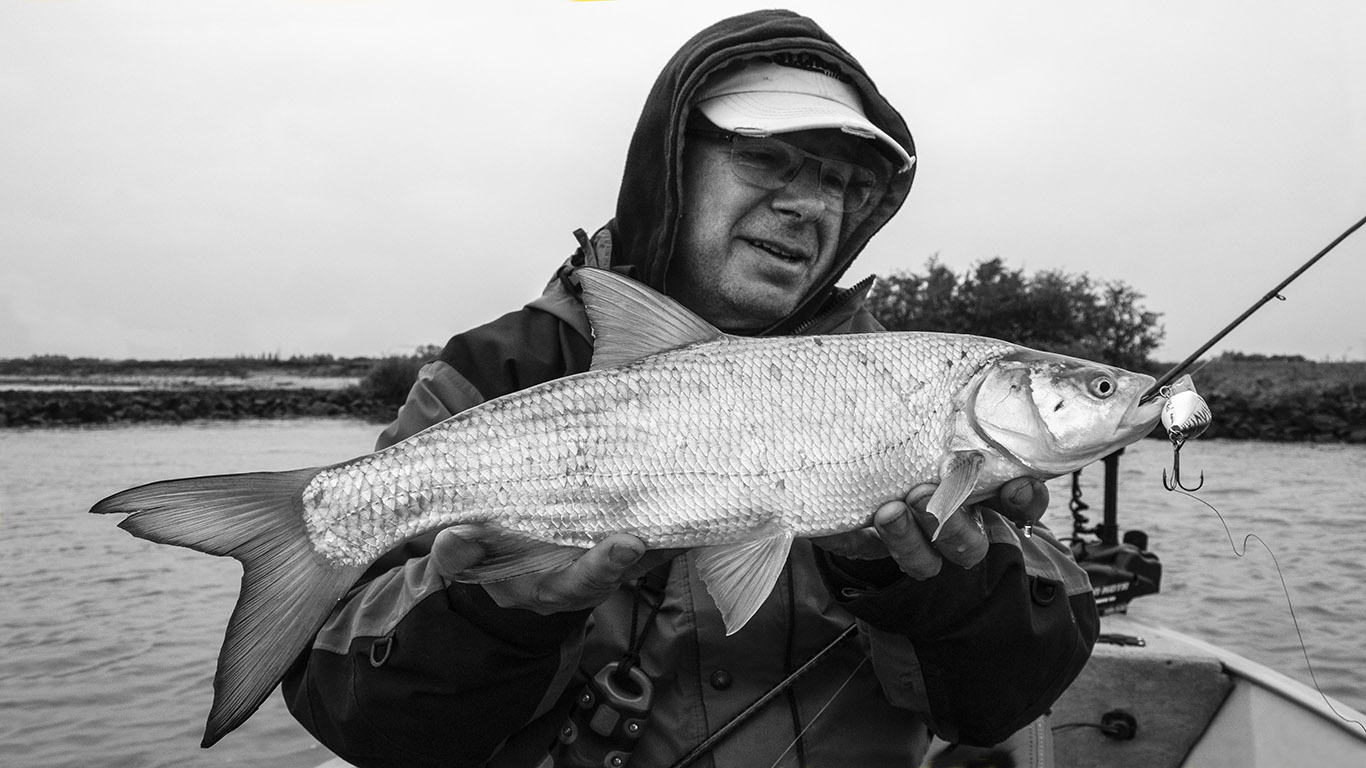 Het was wat zoeken en de eerste vis, een flinke snoekbaars zette ik achteloos terug. We zouden er geen enkele meer zien, op een paar volgers na. Maar het werd een ongelofelijk baarzen- en roofblei bal, het kon niet op. Het waren niet de grootsten maar de aantallen waren geestig en vrij veel vis werd gelost. We konden ons plezier niet op, als kinderen, je kent het wel! Toen werd het middag en de rovers gingen collectief op platte rust. Wat we ook probeerden, het was over en we hadden net zo goed naar huis kunnen rijden. Maar dan had ik Jo’s gebabbel moeten missen…
